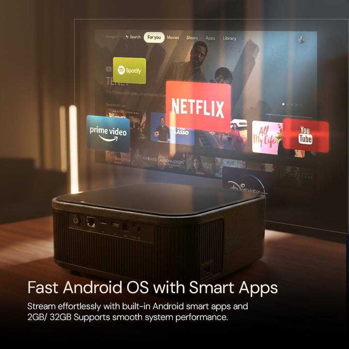 - ✅ Android Projector with Built-In 32GB Storage – Enjoy the latest Android smart projector with 32GB internal memory, allowing you to download and run your favorite apps directly. Stream movies, shows, or presentations seamlessly from YouTube, Netflix, Prime Video, or Google Play without needing extra devices.