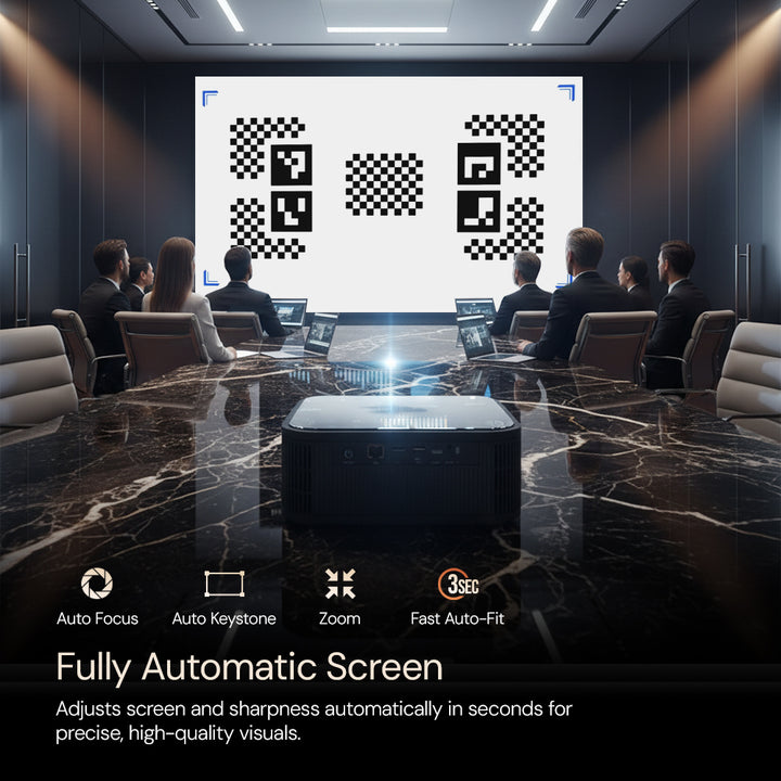 - ✅ Auto Focus & 6D Keystone Correction for Perfect Alignment – Advanced auto focus and ±40° 6D keystone correction ensure a perfectly aligned image from any angle. Designed with a 1.25:1 throw ratio, this short-throw projector delivers a 40–120” display from closer distances, ideal for small rooms or tight spaces.