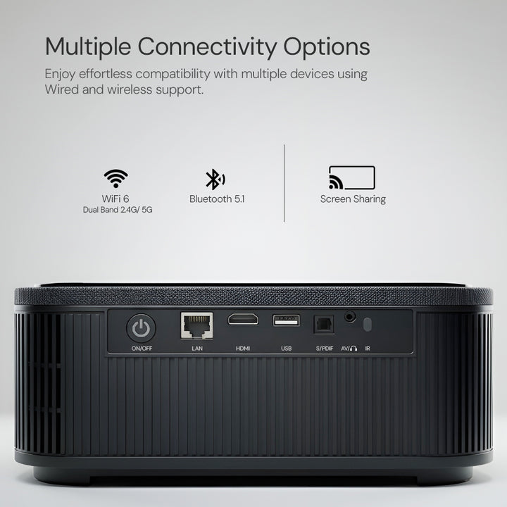 - ✅ WiFi 6 & Bluetooth 5.1 Connectivity for Wireless Freedom – Equipped with the latest WiFi 6 and Bluetooth 5.1 technology, this wireless projector for home and business use ensures smooth streaming and quick pairing with soundbars, speakers, or controllers. Enjoy lag-free mirroring via AirPlay and Miracast for Android and iOS devices.