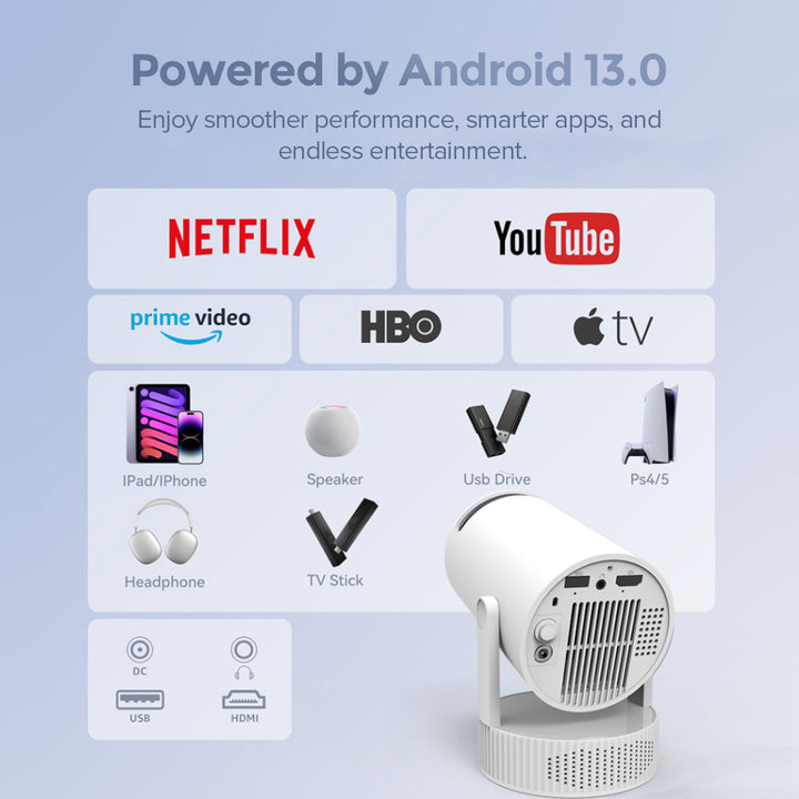 - ✅ Smart Android 13 Mini Projector with 4K Support and WiFi: Experience seamless wireless streaming with the latest Android 13 OS and 713 chipset. This smart mini projector comes with 2GB RAM and 16GB internal storage, allowing you to download apps like YouTube, Netflix, and more directly from the Play Store. With support for 4K video decoding and smooth dual-band 2.4G/5G WiFi, it's the ideal Android projector for home theater, gaming, and business use.